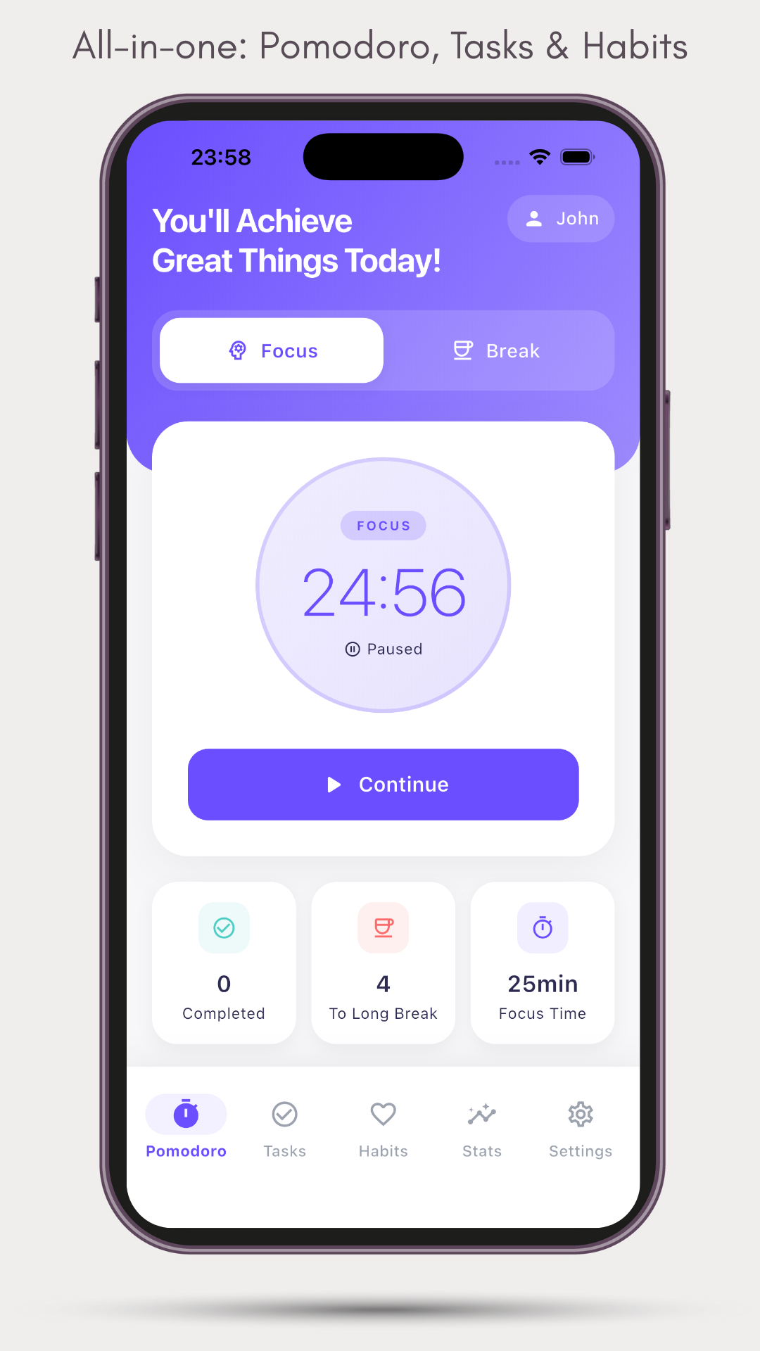 - Pomodoro focus & break timer (custom durations)